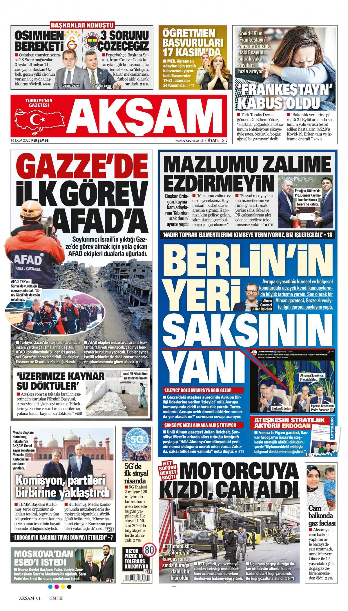 Akşam Gazetesi 16 Ekim 2025 Günü Manşeti