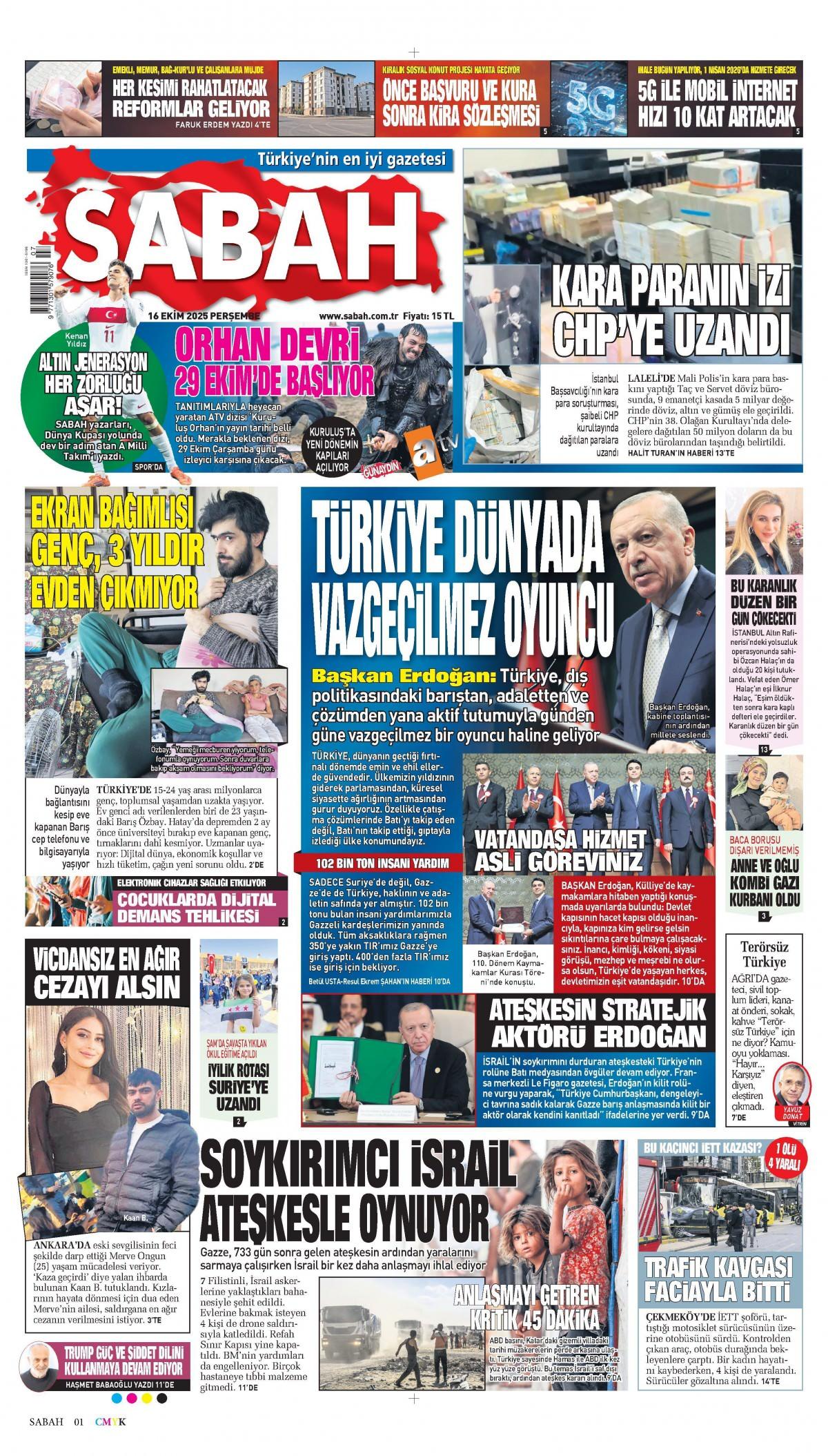 Sabah Gazetesi 16 Ekim 2025 Günü Manşeti
