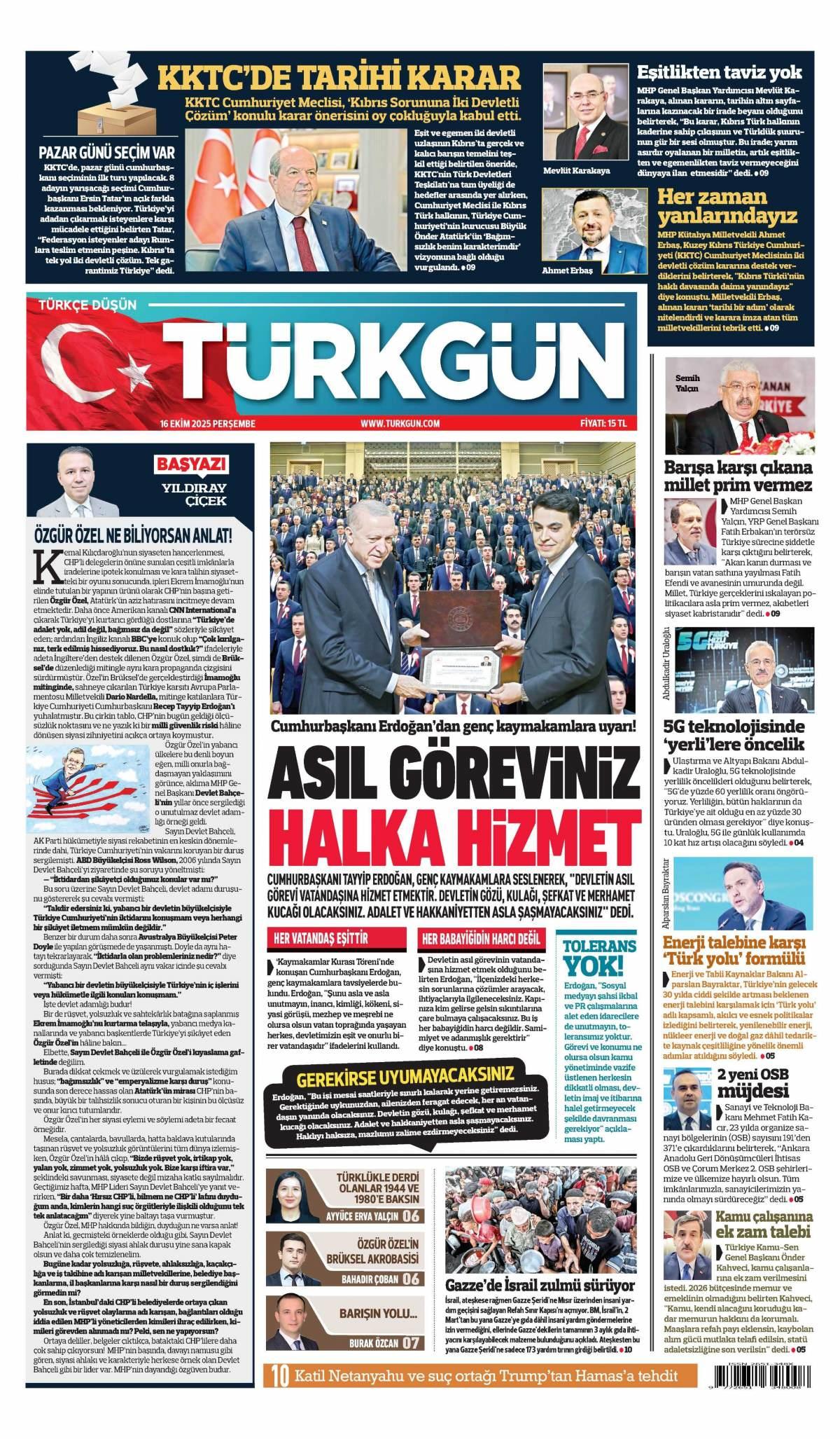 Türkgün Gazetesi 16 Ekim 2025 Günü Manşeti