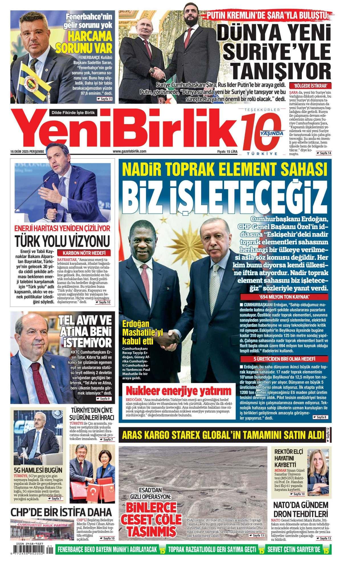 Yeni Birlik Gazetesi 16 Ekim 2025 Günü Manşeti
