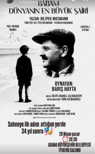 Sahne kariyerine 34 yıl önce Adana’nın tozlu sahnelerinde adım atan usta oyuncu Barış Hayta, köklerine anlamlı bir projeyle dönüyor. Hayta, Türk edebiyatının devi Nazım Hikmet’in hayatını, daha önce hiç anlatılmamış bir perspektiften ele alan “Babam Dünyanın En Büyük Şairi” adlı tek kişilik dramatik oyunla Adanalı sanatseverlerin karşısına çıkmaya hazırlanıyor.